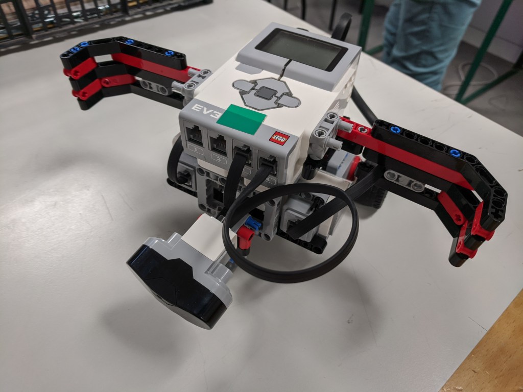 Robot secondaire: nous avons équipé notre robot de deux bras, un de chaque côté, pour qu’il puisse remettre les manches à air debout. La semaine prochaine, nous l’équipons de piles et nous commencerons à travailler sur son déplacement.