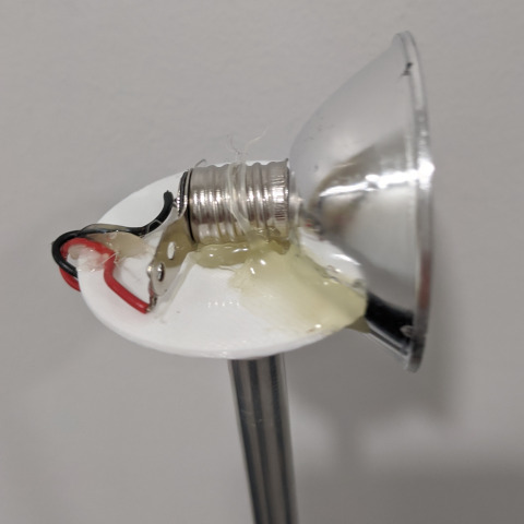 On a installé la lampe sur la plateforme au sommet du phare. On a modélisé la charnière du coude et on a dessiné sur papier le mécanisme de la base.