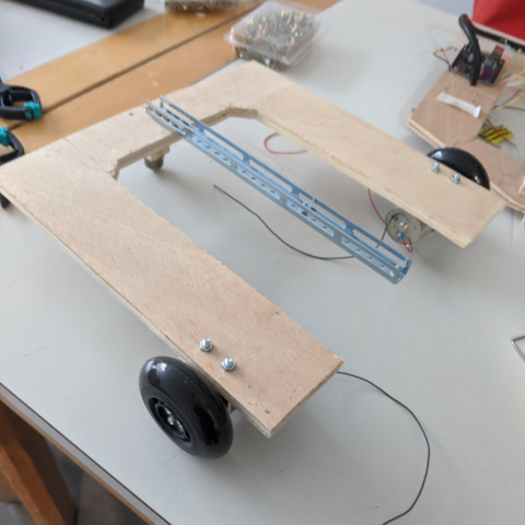 Sur la nouvelle plateforme, on a installé les moteurs, les roues avec les nouveaux moyeux, le séparateur de bouées et la « roue folle ». On a modélisé un support et une fixation servomoteur pour le mat des pavillons.