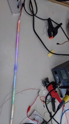 On a soudé des fils et testé le ruban de LEDs avec un programme « arc-en-ciel » trouvé sur un tutoriel.