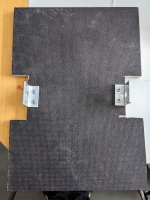 On a découpé une planche de contreplaqué pour faire la nouvelle base de notre robot principal puis fixé les équerres pour installer les moteurs.