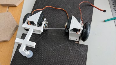 On a fixé les moteurs et les roues, on a tracé la découpe à effectuer à l’avant du robot.