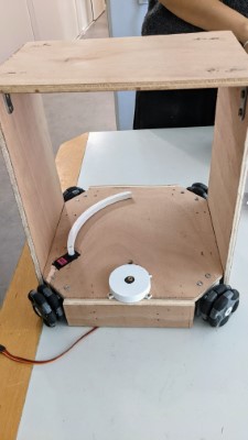 On a installé le « pont » au-dessus du robot (le câble de la télécommande viendra se fixer au sommet). On a également installé les boucliers avant et arrière entre les roues.
