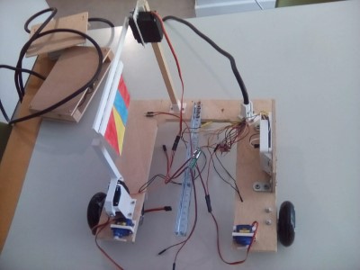 On a câblé 2 boutons supplémentaires sur la télécommande et soudé des fils de commande vers l’Arduino, on scotché des fils sur le robot. On a testé l’actionneur des manches à air (et refixé une roue !). On a décidé comment on allait positionner les pavillons.